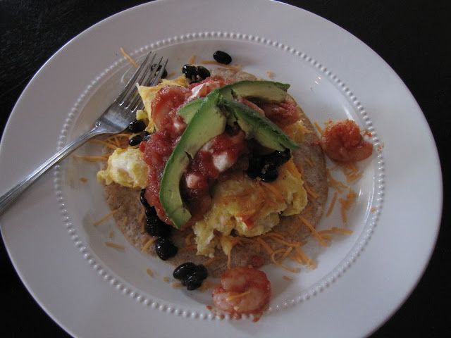 Breakfast on the weekends might quite possibly be the best thing ever. Whether is be a stack of warm pancakes topped with maple syrup or a cheesy omelet stuffed with sauteed vegetables, it's so refreshing to have a break from the typical oatmeal and banana. Well, this past weekend, I made the most outrageously delicious weekend breakfast. It's a warm, crispy tortilla topped with scrambled eggs, cheese, black beans, garlic tomato shrimp, salsa, sour cream, and avocado. On the first bite, my taste buds exploded. It was a truly magical, yummy, delicious, perfect, vacation like breakfast. I strongly suggest you try it. Immediately. Here's the recipe...